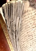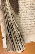 Contrat de mariage, daté 1604. Contrat de mariage entre Jean de la Courtoisie et Antoinette de Peyrelongue. 585 mm x 780 mm. Rédigé sur une peau de vélin non taillée. Conservé dans son écrin de chêne rougi, 920 mm x 200 mm. Le coffret est taillée en un seul bloc, et est surmontée de son couvercle d'origine, relié à l'ensemble par trois lanières de cuir (refaites au XIXe s.). Très bel objet provenant d'une collection particulière du Sud de la France.
