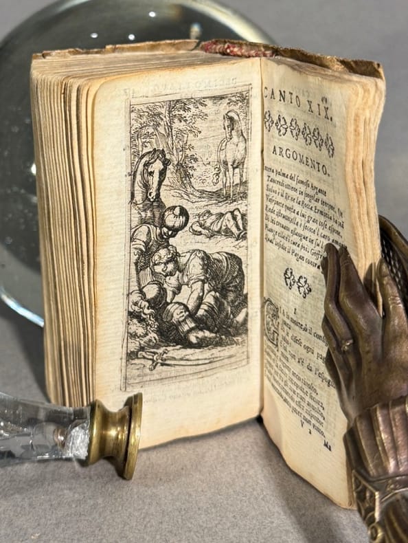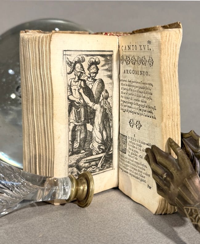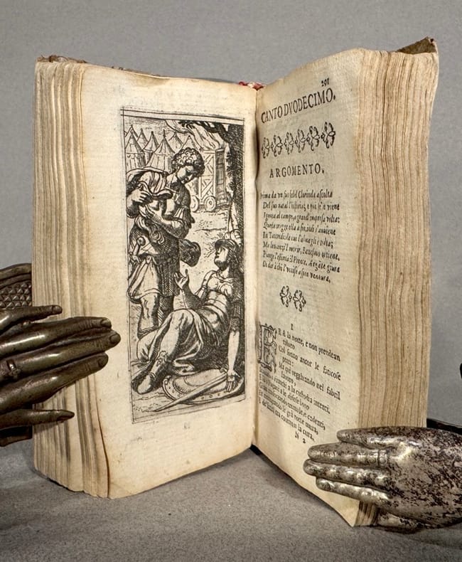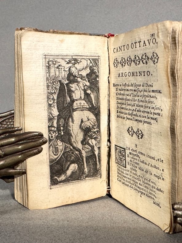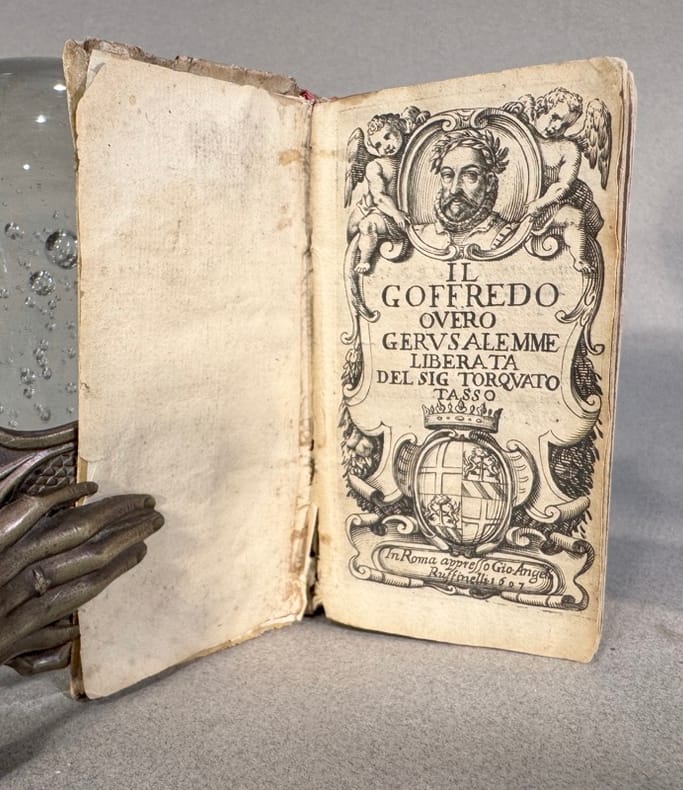 In Roma, appresseo Gio Angel Russinelli 1607 Petit In 12 étroit, Titre gravé, (titre et préface 10ff), 532 pp, marque au dauphin de Louis Zenetti sur le dernier feuillet relié dans un plein vélin de l’époque, titre inscrit à la plume « Torquato Tasso ». Agréable édition en reliure du temps, illustrée des gravures sur cuivre très encrées par Tempesta. Ouvrage illustré de vingt gravures d’Antonio Tempesta placé en regard des vingt chants composant la Jérusalem délivrée.